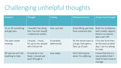 Unhelpful thoughts impact our actions and outputs/behaviours. Challenging these thoughts can help to change our approach to activities.