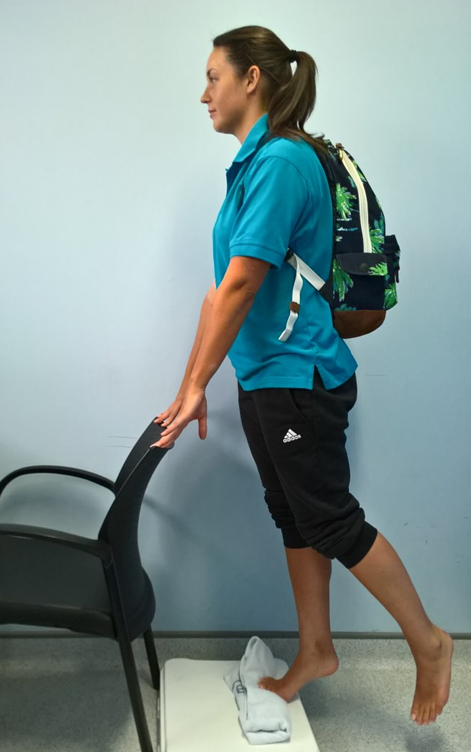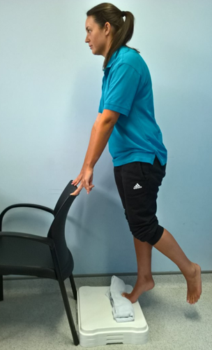 - On the edge of a step, standing on affected leg with towel rolled up under your toes.