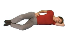 Lying on your side, keep the leg on the bed bent and the upper leg straight.